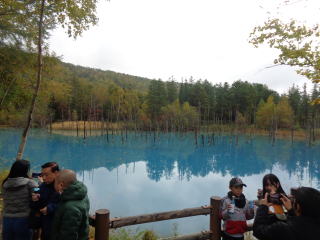 白金青い池:十勝岳の防災工事の際、堰堤にたまった水が、不思議なほど青い色をたたえ、立ち枯れのカラマツとあいまって幻想的な風景に。いつしか「青い池」とよばれるようになった。これは、白金温泉街にある白ひげの滝など、水酸化アルミニウムなどを含んだ水が美瑛川の水と混ざり、コロイドという微粒子を生成。その粒子に太陽の光が当たると波長の短い青い光が散乱されて目には青く見えるからとか。美瑛川を別名「ブルーリバー」ともいい、この水がたまったものが青い池