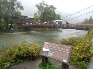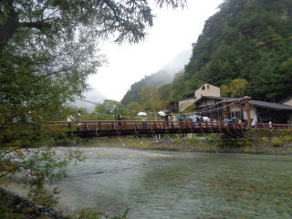 河童橋:清流、梓川に架かる上高地のシンボル的存在の吊り橋。橋の上から奥穂高岳(3190m)、吊尾根、前穂高岳(3090m)などの穂高連峰の勇壮な景観を眺めることができ、記念写真を撮る人々で、いつも賑わっている。橋の名の由来は定かではなく、かつて河童が棲んでいそうな深い淵があったからなど、いくつかの説がある。上高地ビジターセンターには、昔の河童橋周辺の写真と解説があるので、のぞいてみたい。